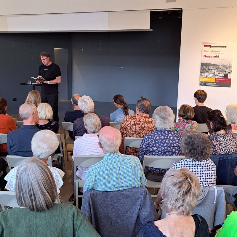 Der Heilbronner Friedensrat zeigte die Ausstellung der IPPNW zum 80. Jahrestag der Atombombenangriffe auf Hiroshima und Nagasaki in den städtischen Ausstellungsräumen auf der „Inselspitze“ in Heilbronn.